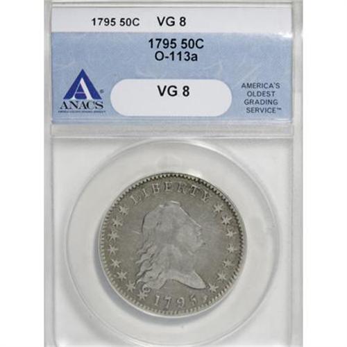 <B>1795 50C 2 Leaves VG8 ANACS.</B></I> O-113a, R.4. Specialists of 1795 halves soon learn to look for the large die lump beneath the bust tip to identify the familiar O-113 variety. The later die state has a faint crack atop LIBERTY. All legends, stars, and berries are bold, and traces of hair definition are present on the portrait. This pearl-gray and almond-gold type coin has a smooth appearance and good eye appeal.<BR><BR><B>Coin Engraver:</B> Robert Scot<BR><BR><b>Shipping:</b> Coins & Currency (<a target="_blank" href="http://www.heritageauctions.com/common/shipping.php">view shipping information</a>)