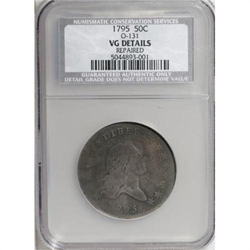 <B>1795 50C 2 Leaves--Repaired--NCS. VG Details.</B></I> O-131, High R.4. On the obverse, the point of the bust is positioned between two points of star 15 and there is a faint lump to the right of the 5 in the date. The reverse shows the diagnostic recutting on the right side of A3. The reverse is lightly cracked from the edge to the top of A2. The overall quality does not permit a more accurate description as significant details are missing in the center of the reverse and left portion of the obverse.<BR> Cleaned with rough surfaces that exhibit light gray color. Both sides have light scratches and other defects. Wavy central surfaces indicate minor repair.<BR> The consignor acquired this piece as a possible Silver Plug coin, although it is not.<BR> Haseltine-14; Beistle 13a-T; Overton-64; Hilt 13-L; PCGS #6052; <I>Encyclopedia</B></I>-4553.<BR><I>Ex: Panther Precious Metals (2002).<BR>From The Westmoreland County Collection of Early Bust Halves, Part Two.</B></I><BR><BR><b>Shipping:</b> Coins & Currency (<a target="_blank" href="http://www.heritageauctions.com/common/shipping.php">view shipping information</a>)