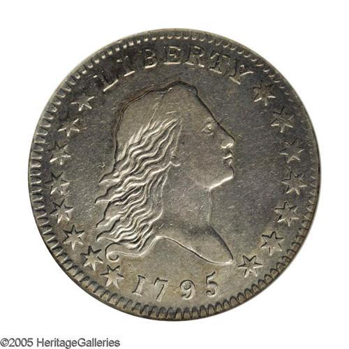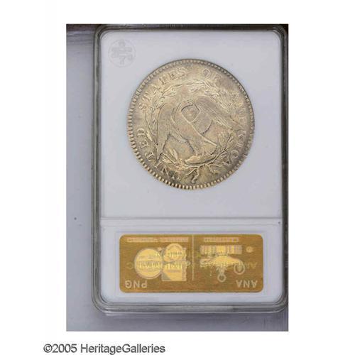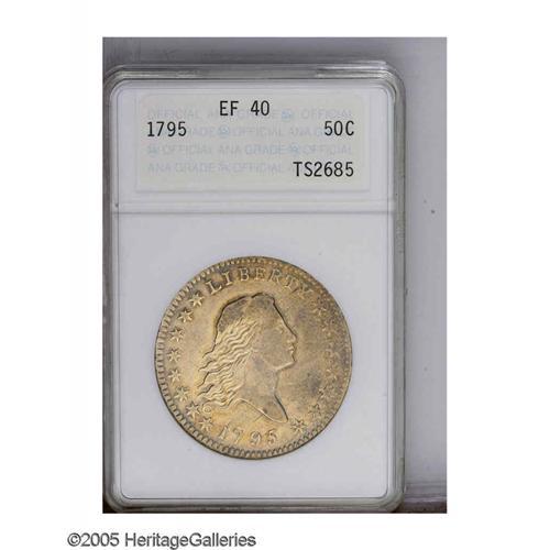 <B>1795<50C> 2 Leaves XF40 ANACS.</B></I> O-102, R.4. Gentle tan and gunmetal-gray colors visit this bright example. The fields are slightly reflective, and are surprisingly unblemished for the moderately circulated grade. Luster dominates the wreath and Liberty's lower curls. A pair of nearly vertical marks behind the ear are not especially prominent. This introductory two year type is under strong collector demand.