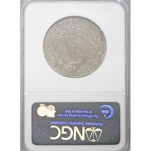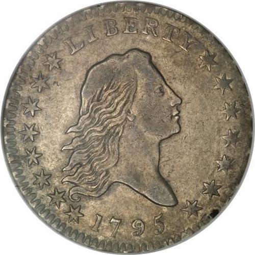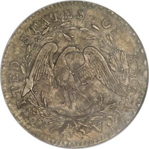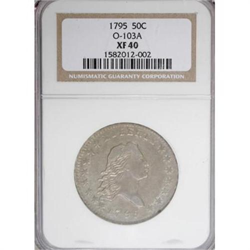 <B>1795 50C 2 Leaves XF40 NGC.</B></I> O-103a, R.5. This important late die state has a massive rim break on the reverse, joining the tops of AM to the border over E, spanning 10 mm of the border. Curiously, this collectible die state was missing from the Jules Reiver Collection that was formed over decades and encompassed both varieties and die states. Unlike the coin photographed in the Overton reference, this coin is not weak on stars 10, 11, 12, and 13. Listed at the top of the recorded examples on Stephen Herrman's auction survey for this variety. This piece is tied with one other XF40 as finest in his listing and it is almost certainly the finest known of the late die state coins.<BR>An attractive coin, the surfaces are lilac and rose-gray on each side with more of a mottled effect on the reverse. Identifiable as the DeVries coin by a dark russet spot on the obverse rim at 5 o'clock, and by the distinctive toning pattern on the reverse. Only the slightest remnants of mint luster still show around the devices. The only mark of note, and a further pedigree identifier, is small and located next to the eagle's left (facing) leg. <BR>Haseltine-20; Beistle 1b-Ba; Overton-18; Hilt 20-O; PCGS# 6052; Encyclopedia-4560.<BR><I>Ex: DeVries Collection (Stack's, 9/1996), lot 1224; Gerald Shertz; Sheridan Downey (11/1997).<BR>From The Westmoreland County Collection of Early Bust Halves, 1794-1807.</B></I><BR><BR><B>Coin Engraver:</B> Robert Scot<BR><BR><b>Shipping:</b> Coins & Currency (<a target="_blank" href="http://www.heritageauctions.com/common/shipping.php">view shipping information</a>)