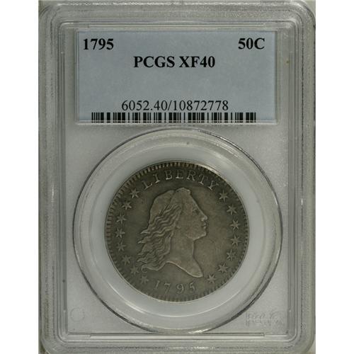<B>1795 50C 2 Leaves XF40 PCGS.</B></I> O-102, R.4. A fine die crack runs from the bust point to the rim nearby, while on the reverse the berries are arranged nine and eight, the only reverse of this year so arranged. A small center dot is on the eagle's right (facing) wing near the breast. The surfaces are steel-gray with silver highpoints. A small scrape is noted in the right field beneath Liberty's chin.<BR><BR><b>Shipping:</b> Coin/Currency (<a target="_blank" href="http://www.heritageauctions.com/common/shipping.php">view shipping information</a>)