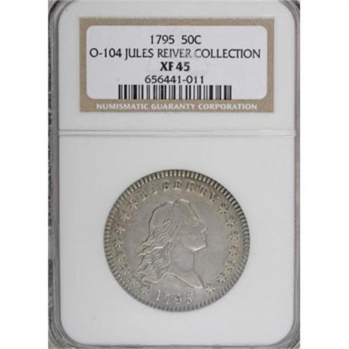 <B>1795 50C 2 Leaves XF45 NGC.</B></I> O-104, R.4. The obverse has a fine die crack from the border over L, through the tops of IBERTY to star 9 and the border over star 10. A second crack joins stars 10 through 12. The reverse has a fine die crack from the border through the right side of C and another through the right facing wing, similar to the early states of O-103. The M in AMERICA is sharply recut with the entire left side of that letter clearly doubled.<BR>Close to the Condition Census for the variety, this piece probably ranks about seventh finest of the variety. Bright silver-gray surfaces are devoid of significant abrasions, and exhibit nicely defined design elements. Considerable luster is still evident in the fields on both sides, especially in the protected areas near the devices. All of the dentils are complete and bold. Crisscrossing adjustment marks are distributed over the central reverse. Still, a pleasing Choice XF example, ideal for date or type collectors.<BR>Haseltine-26; Beistle 6-Bc; Overton-8; Hilt 18-O; PCGS# 6052; Encyclopedia-4560.<BR><I>Ex: Jules Reiver (Heritage, 1/2006), lot 22482.<BR>From The Westmoreland County Collection of Early Bust Halves, 1794-1807.</B></I><BR><BR><B>Coin Engraver:</B> Robert Scot<BR><BR><b>Shipping:</b> Coins & Currency (<a target="_blank" href="http://www.heritageauctions.com/common/shipping.php">view shipping information</a>)