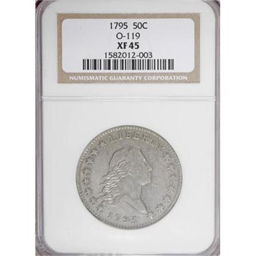 <B>1795 50C 2 Leaves XF45 NGC.</B></I> O-119, R.4. On the obverse, the diagnostic elongated die defect lump is visible above the point of star 15 and the point of the bust, and the die crack seen on most specimens from the edge through star 15 to the bust is only apparent between the edge and lower star point on this example. On the reverse, the I in UNITED is recut, a die defect line extends from the tip of the left (right facing) wing to the top-right of the E in AMERICA, and another travels straight out from the wing tip to join a defect line from the top left serif of the R in AMERICA.<BR>Light silver-gray patination, imbued with traces of powder-blue and lilac, covers semi-bright surfaces. The design elements display relatively sharp delineation, particularly in Liberty's hair strands, and on most of the eagle's wing, tail, and leg plumage. The dentils are complete on both sides. A few light circulation marks are consistent with the grade, and faint adjustment marks are noted around portions of the obverse border.<BR>Haseltine-9; Beistle 9b-Na; Overton-44; Hilt 8-F; PCGS# 6052; Encyclopedia-4555.<BR><I>Ex: Harry Laibstain (2/2002).<BR>From The Westmoreland County Collection of Early Bust Halves, 1794-1807.</B></I><BR><BR><B>Coin Engraver:</B> Robert Scot<BR><BR><b>Shipping:</b> Coins & Currency (<a target="_blank" href="http://www.heritageauctions.com/common/shipping.php">view shipping information</a>)