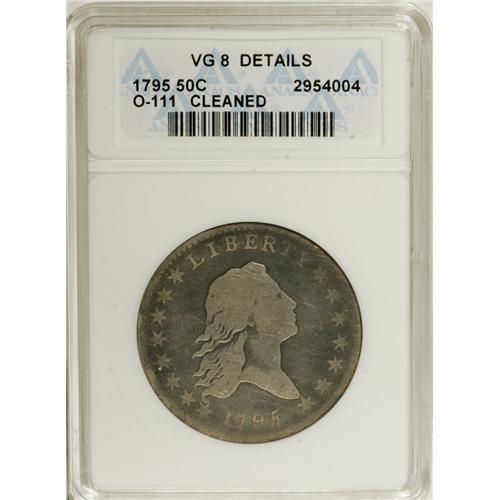 <B>1795 50C 3 Leaves--Cleaned--ANACS. VG8 Details.</B></I> O-111, High R.4. The only die marriage with a triple leaf beneath each wing. This variety is also interesting for its heavy die break at 10 o'clock on the reverse. The reverse is ocean-blue, and the obverse is tan-gray. Both sides are hairlined and a bit bright.<BR><I>From The Hoosier Discovery Collection.</B></I><BR><BR><b>Shipping:</b> Coins & Currency (<a target="_blank" href="http://www.heritageauctions.com/common/shipping.php">view shipping information</a>)