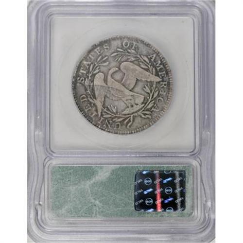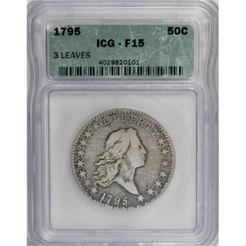 <B>1795 50C 3 Leaves Fine 15 ICG.</B></I> O-111, High R.4. This is the famous 1795 Three Leaves variety, with triple leaf clusters inside the wreath below each wing. It stands as an important <I>Guide Book</B></I> variety, and it is considered by some to be a separate design type. Just a single reverse die is known to represent this type, and it was combined with only one obverse die, thus O-111 is the only Three Leaves die variety. The obverse die is also distinctive, with the date sharply recut, the first impression nearly touching the border.<BR>A heavy curved die crack from the border through the left side of the first S continues through the wreath, the eagle's wing, and the eagle's body, to the uppermost tailfeather. The area above this crack is on a higher plane. Note that the wing and breast feathers below the crack are nicely detailed and those above the crack are entirely flat.<BR>Both sides have the usual minor blemishes on pleasing pewter-gray surfaces with deeper gold, blue, and iridescent toning that outlines the devices and hugs the borders. Full borders are evident on the obverse and reverse with a smattering of faint adjustment marks along the reverse border.<BR>Haseltine-23; Beistle 4-H; Overton-27; Hilt 16-Y; PCGS# 6053; Encyclopedia-4563.<BR><I>Ex: Robert Zornes.<BR>From The Westmoreland County Collection of Early Bust Halves, 1794-1807.</B></I><BR><BR><B>Coin Engraver:</B> Robert Scot<BR><BR><b>Shipping:</b> Coins & Currency (<a target="_blank" href="http://www.heritageauctions.com/common/shipping.php">view shipping information</a>)
