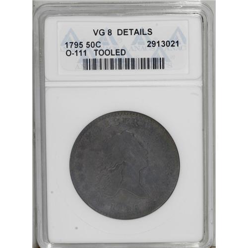 <B>1795 50C 3 Leaves--Tooled--ANACS. VG8 Details.</B></I> O-111, High R.4. Soft gold and violet patina graces this heavily worn piece. An area to the right of the bust, which has graffiti in the form of an X, has been tooled to little effect.<BR><I>From The Jones Beach Collection.</B></I><BR><BR><b>Shipping:</b> Coin/Currency (<a target="_blank" href="http://www.heritageauctions.com/common/shipping.php">view shipping information</a>)