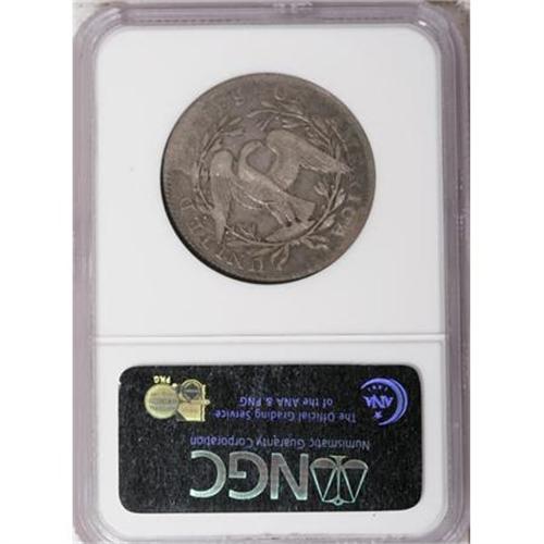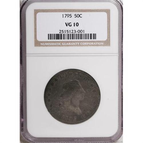 <B>1795 50C 3 Leaves VG10 NGC.</B></I> O-111, High R.4. A popular Overton variety for two different reasons: the date is widely repunched south, and the reverse has three leaves beneath each wing. As usual, a prominent die break crosses the left (facing) wing and affects the STA in STATES. Dusky steel-gray toning drapes this nicely detailed and unblemished collector coin.<BR><BR><b>Shipping:</b> Coins & Currency (<a target="_blank" href="http://www.heritageauctions.com/common/shipping.php">view shipping information</a>)