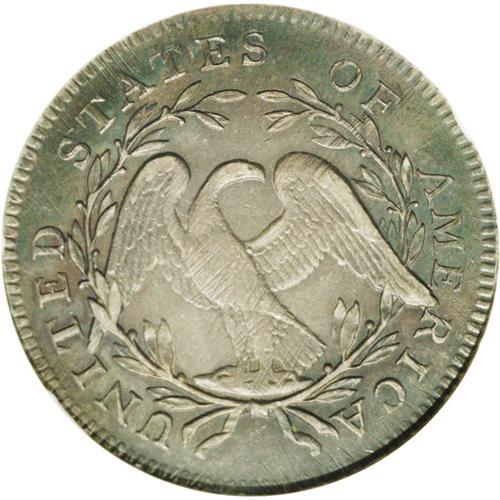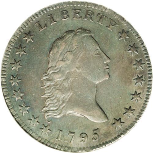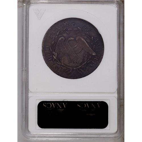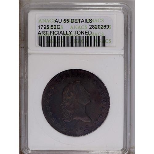 <B>1795<50C> Small Head--Artificially Toned--ANACS. AU55 Details.</B></I> O-126a, High R.4. The head and bust are noticeably smaller and narrower than the normal type. On this variety, a small die crack shows from the edge through the E in UNITED. This is a very rare offering. Each side exhibits a mottled, unnatural steel-gray finish intermixed with purple and green colors. A number of crisscrossing adjustment marks are seen on the reverse, and a couple of minor marks are seen on Liberty's cheek and neck. As an R.4 variety, this is a seldom offered example.