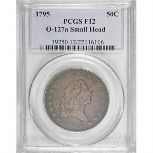 <B>1795 50C Small Head Fine 12 PCGS.</B></I> O-127a, High R.6. Like other examples from Overton's reverse H, this piece exhibits a fine die crack from the lower border that curves into the wreath to the E of UNITED. There is no evidence of the small crack over OF, but this may be due to wear. The obverse die is shattered with a crack from the border to right tip of the 5 and the bust and another the border through star 7 to the back of Liberty's head. Most spectacular are parallel die cracks through Y and star 9, both to Liberty's nose, with the area between these cracks raised to form a retained cud. The interesting conclusion one comes to when studying this coin is that the workhorse reverse die (four die pairings) outlasted the single-use obverse die.<BR> An outstanding example with deep gray surfaces and deeper steel toning near the borders. Aside from a few tiny rim nicks, this piece is essentially flawless. <BR> Haseltine-19; Beistle 19a-Gb; Overton-59; Hilt 25-Z; PCGS# 6054; Encyclopedia-4564.<BR><I>Ex: Michael Summers (5/2005).<BR>From The Westmoreland County Collection of Early Bust Halves, 1794-1807.</B></I><BR><BR><B>Coin Engraver:</B> Robert Scot<BR><BR><b>Shipping:</b> Coins & Currency (<a target="_blank" href="http://www.heritageauctions.com/common/shipping.php">view shipping information</a>)