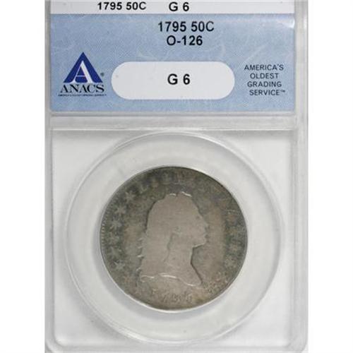 <B>1795 50C Small Head Good 6 ANACS.</B></I> O-126, R.4. One of three Overton marriages of the very scarce Small Head subtype. Powder-blue and stone-gray toning embraces this evenly circulated representative. A faded thin mark crosses the right (facing) wing, but the surfaces appear smooth to the unaided eye.<BR><BR><b>Shipping:</b> Coins & Currency (<a target="_blank" href="http://www.heritageauctions.com/common/shipping.php">view shipping information</a>)