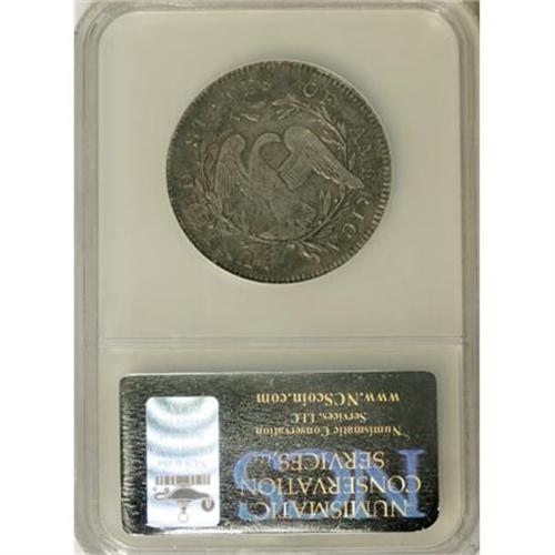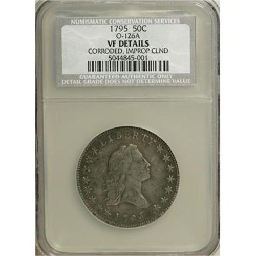 <B>1795 50C Small Head--Corroded, Improperly Cleaned--NCS. VF Details.</B></I> O-126a, High R.4. The obverse appears to have a crack from the left top of E to the border over B, although it is possible that this may actually be a result of the surface quality and not a die defect. The reverse has the usual crack through the lower left part of the wreath.<BR> Light gray color at the centers gradually changes to deeper gray-brown near the borders. Both sides have finely distributed porosity over most of the surfaces. The impression is nicely centered with full borders on each side. <BR> Haseltine-15; Beistle 15-Ga; Overton-56; Hilt 24-Z; PCGS #6054; <I>Encyclopedia</B></I>-4564.<BR><I>Ex: Alpine Numismatics (9/2003).<BR>From The Westmoreland County Collection of Early Bust Halves, Part Two.</B></I><BR><BR><b>Shipping:</b> Coins & Currency (<a target="_blank" href="http://www.heritageauctions.com/common/shipping.php">view shipping information</a>)