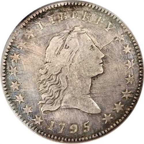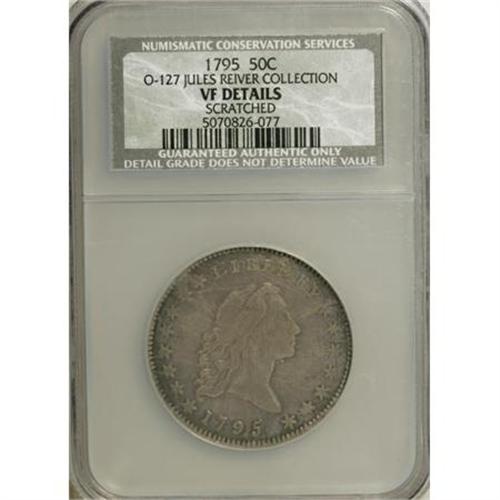 <B>1795 50C Small Head--Scratched--NCS. VF Details. </B></I> O-127a, High R.6. <B>The obverse is plated in Beistle as number 19a. The obverse and reverse are plated in the 1967 first edition of Overton as number 59.<BR> </B></I>A heavy die crack through star 9 to Liberty's nose is present, as always, and prominent die cracks are also noted through the 5 in the date, on the back of Liberty's neck, and from the bust toward star 7. The Overton reference under O-127a apparently has a typo, and should read "right of 5" instead of "right of E." (This was corrected in the fourth edition.) A circular die crack over OF is accompanied by a small cut, representing an ill-fated attempt to remove part of this crack.<BR> This variety was rated R.5 in the third edition of Overton, but has proven to be much scarcer than previously believed. Only six examples have appeared for auction sale over the years, and just one of those carried a grade higher than VG10. This is clearly an important Condition Census example, despite the obverse and reverse defects. Clusters of pinscratches affect LIBERTY and AMERICA. The obverse field shows additional moderate crisscross scratches, which look like adjustment marks at first glance. Subdued lavender and electric-blue colors envelop this rare variety half dollar. <BR> Haseltine-19; Beistle 19a-Gb; Overton-59; Hilt 25-Z; PCGS #6054; <I>Encyclopedia</B></I>-4564.<BR><I>Ex: Floyd Farley (4/1983); Jules Reiver (Heritage, 1/2006), lot 22507.<BR>From The Westmoreland County Collection of Early Bust Halves, Part Two.</B></I><BR><BR><b>Shipping:</b> Coins & Currency (<a target="_blank" href="http://www.heritageauctions.com/common/shipping.php">view shipping information</a>)