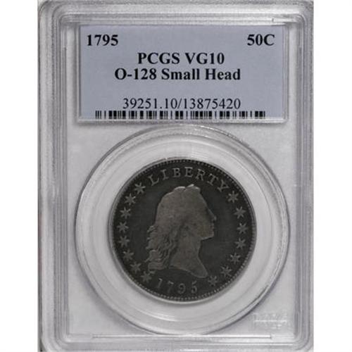 <B>1795 50C Small Head VG10 PCGS.</B></I> O-128, High R.5. This Small Head variety is most easily attributed by the reverse, which is unique among 1795 halves. It has a 9-9 berry arrangement with two inside the wreath on the left, and two inside the wreath on the right.<BR> Both dies appear to be perfect with no cracks or other die defects. However, a tiny planchet crack (not a die crack) is located above the L in LIBERTY. There is also a shallow planchet lamination in the left obverse field out from stars 4 and 5. <BR> An attractive two-tone example with deep gray color in the fields and lighter tan devices. A few old scratches can be seen on each side, but they are entirely blended with the rest of the surfaces. <BR> Haseltine-24; Beistle 17-V; Overton-60; Hilt 23-X; PCGS #6054; <I>Encyclopedia</B></I>-4564.<BR><I>Ex: Henry Hilgard; Sheridan Downey (8/2006).<BR>From The Westmoreland County Collection of Early Bust Halves, Part Two.</B></I><BR><BR><b>Shipping:</b> Coins & Currency (<a target="_blank" href="http://www.heritageauctions.com/common/shipping.php">view shipping information</a>)