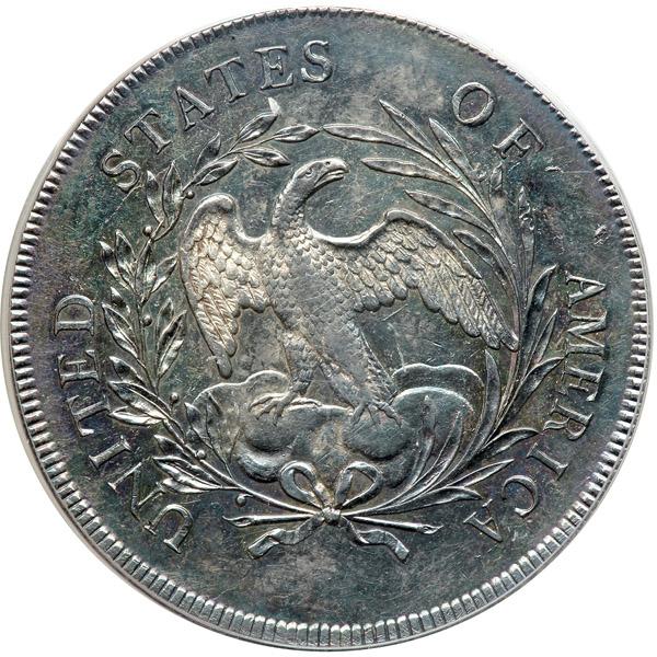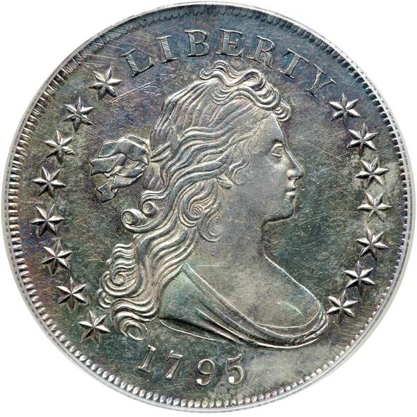 1795 introduced the new Draped Bust design, believed to be the work of portraitist Gilbert Stuart, who prepared sketches that were translated to plaster models by John Eckstein, an artist at the Mint. Records show that Eckstein was paid $30 for "two models for dollars" on September 9, 1795. This may refer to the coin of this new design. The date these coins were first struck is unknown, and the last date of their coinage is also unknown, perhaps continuing into 1796. Pop 1; none finer at PCGS for the variety (PCGS # 39995) .