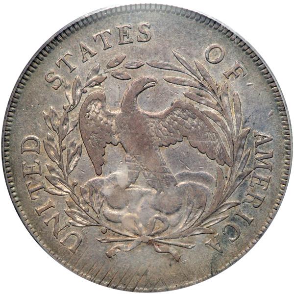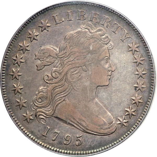 1795 B-15, BB-52 Rarity 2. PCGS graded EF-45. Nice even grey toning on both sides. Centered Bust. Desirable transition type for 1795 featuring the new draped bust Liberty paired to a modified small eagle reverse. This combination would be struck only into 1798, producing a scarce Type that collectors admire. Pop 41; 81 finer (PCGS # 6858) .