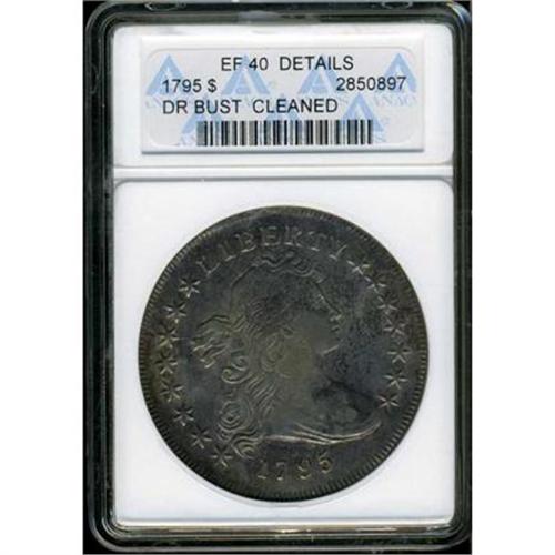 <b>1795 Draped Bust Dollar. Centered bust. ANACS graded Details of EF40 DR Bust Cleaned.</b> BB-52 with the bust properly placed on the die. Cleaned and recolored at one time but the underlying detail is consistent with Extremely Fine quality, including nice, problem-free rims <b>(PCGS # 6858)</b> <i>