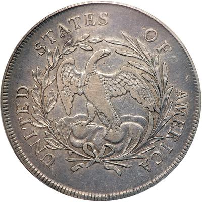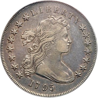 1795 B-15, BB-52. Rarity 2. PCGS graded EF-40. Smooth medium gray patina on choice surfaces of this attractively toned Extremely Fine specimen. A duality of shades can be seen on both sides, with the lightest on the high points of the face, hair curls, shoulder and drapery, with accents as well on the eagle's breast and wing edges. Some light adjustment marks found on the reverse. Full sharp wreath. The strike is somewhat spongy on some of these BB-52 survivors, though the design elements are very sharp on this particular specimen and so confirming the grade. Rims are free from breaks or dents. Pop 2; 4 finer for the variety. (PCGS # 39995).