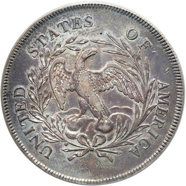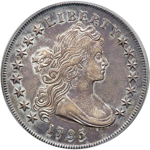 1795 Draped Bust Dollar. PCGS graded AU-50. CAC Approved. Pop 1; 4 finer, 1 in 55, 2 in 58, 1 in 61. Both sides exhibit gun metal grey coloration with a trace of golden undertones. Well struck on the main features. In 1795, a transition occurred when the Flowing Hair style Liberty head gave way to the more upright and formal Draped Bust design. Liberty's hair is tied with a ribbon at the back. A new (still small) eagle is substituted for the 1794-95 version. Well struck in all areas, Liberty displays her hair curls to full effect on this sharp AU50 specimen. The eagle, too, is finely detailed. Moreover -- and benefitting prospective buyers -- the original planchet must have met the weight standard and so there was no need to "adjust" it. Hence, the surfaces are entirely free of adjustment, a decided bonus in terms of value and, of course, eye-appeal. BB-52 has the Liberty's head centered within the circule of stars, LIBERTY and the date below. A chip out of the die causes a short raised area of metal in the hair to the right of the ribbon on all known specimens, this is a diagnostic of the BB-52 variety (PCGS # 39995) .