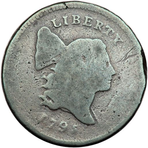 1795 C-1a R2 Lettered Edge G4. Very slightly sharper but there is a dent on the rim before the face plus a few additional contact marks on both sides. Rather glossy dark steel brown with slightly lighter chocolate and steel toning in protected areas. The date is easily readable but a few letters of the legends are faint or missing. LDS, Manley state 2.0. The swelling at AME is obvious. Weight 95.6 grains.