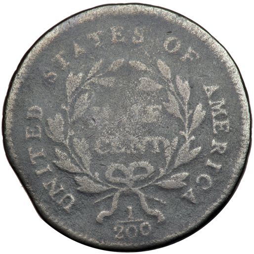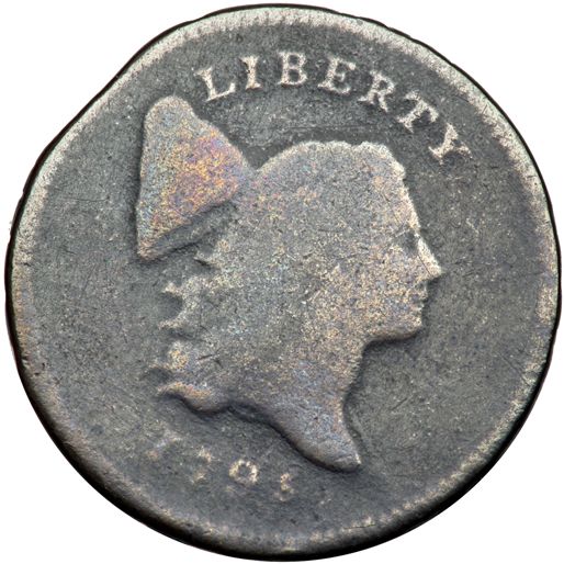 1795 C-1a R2 Lettered Edge G5. Clipped Planchet. Slightly glossy dark olive and steel with slightly lighter chocolate brown toning on the highpoints. The planchet is covered with extremely fine roughness, but it is mostly hidden under the natural patina. No marks or verdigris. A nearly straight planchet clip (end of strip?) affects the dentils at the cap and the opposing ones over UNIT. The date and legends are complete and readable but they are not strong. The edge lettering is complete except for the D in DOLLAR, which was lost in the clip. EDS, Manley state 1.0. Weight 94.4 grains.