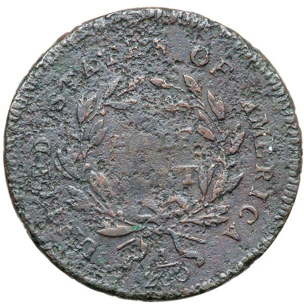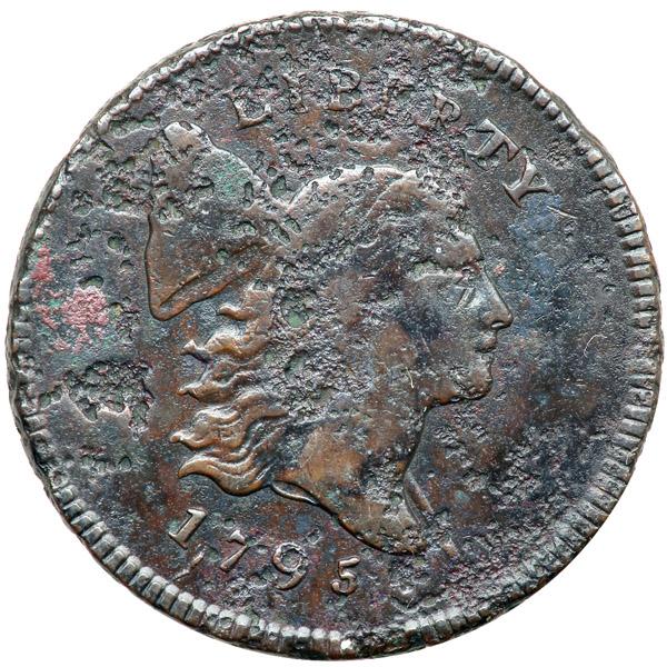 1795 C-2a R3 Punctuated Date with Lettered Edge G4. Sharpness VF35 or so but much of the planchet is pitted. No marks or verdigris, but the pitting destroys the eye appeal of an otherwise sharply detailed piece. Dark chocolate and olive, and the smooth areas on the obverse display attractive natural gloss. The date is strong and the comma between the 1 & 7 is bold. LDS. Weight 101.3 grains.