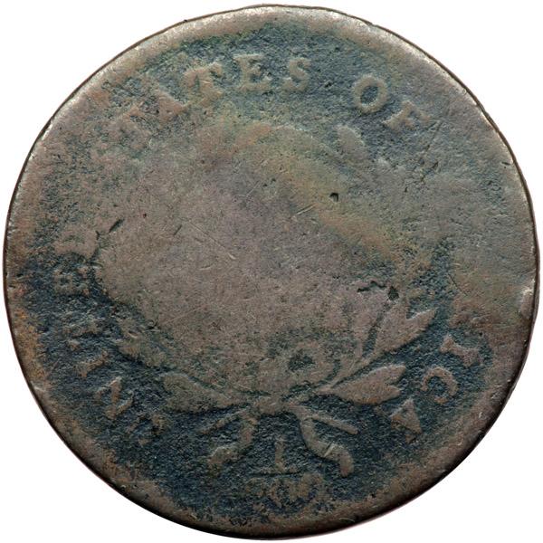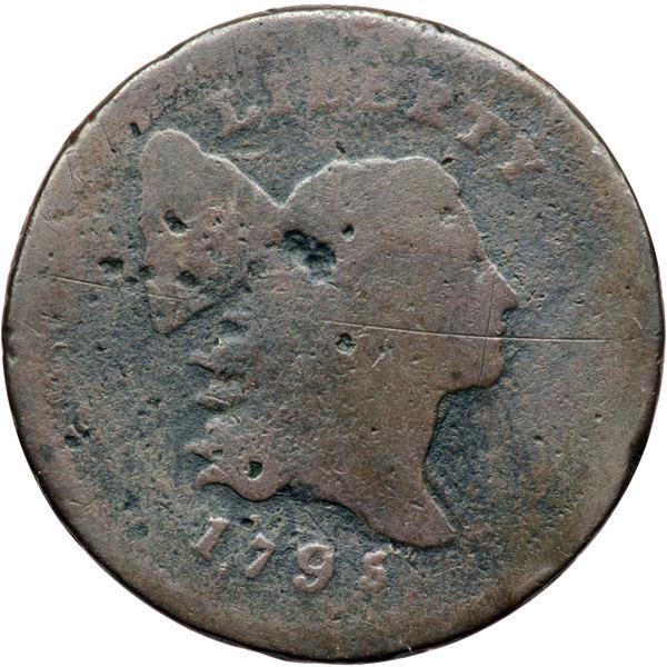 1795 C-2a/b R7+ Punctuated Date, Thin Planchet with Lettered Edge AG3. Thin, Underweight Planchet. Very slightly sharper with a dozen pitmarks on the obverse, the largest ones on the back of the head, plus a light horizontal hairline scratch across the obverse passing through the mouth. A dull dent near the back of the head created a slight bulge on the reverse that caused excessive wear inside the wreath obliterating HALF CENT. Slightly glossy steel brown with dark olive brown toning in the fields and protected areas. The date is clear and most of the legends remain visible, although not strong. Struck on a thin planchet that has a clearly lettered edge, although the letters don't quite fit on the limited space available. Obviously this is a thin planchet that went through the edge lettering process in error. Weight 82.1 grains. Davy #95.2c.2.