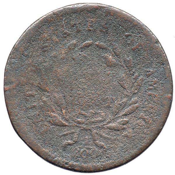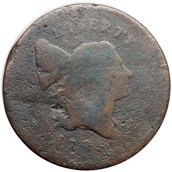 1795 C-3 R5+ Punctuated Date Fair-2. A couple points sharper but covered with fine granularity and slightly bent causing the obverse to bulge outward a bit in the center. No verdigris or notable signs of contact. Recolored chocolate brown and olive. The date is weak but nearly complete and still readable, as is LIBERTY and most of the reverse legend. The comma between the 1 & 7 is faint. Weight 73.9 grains.