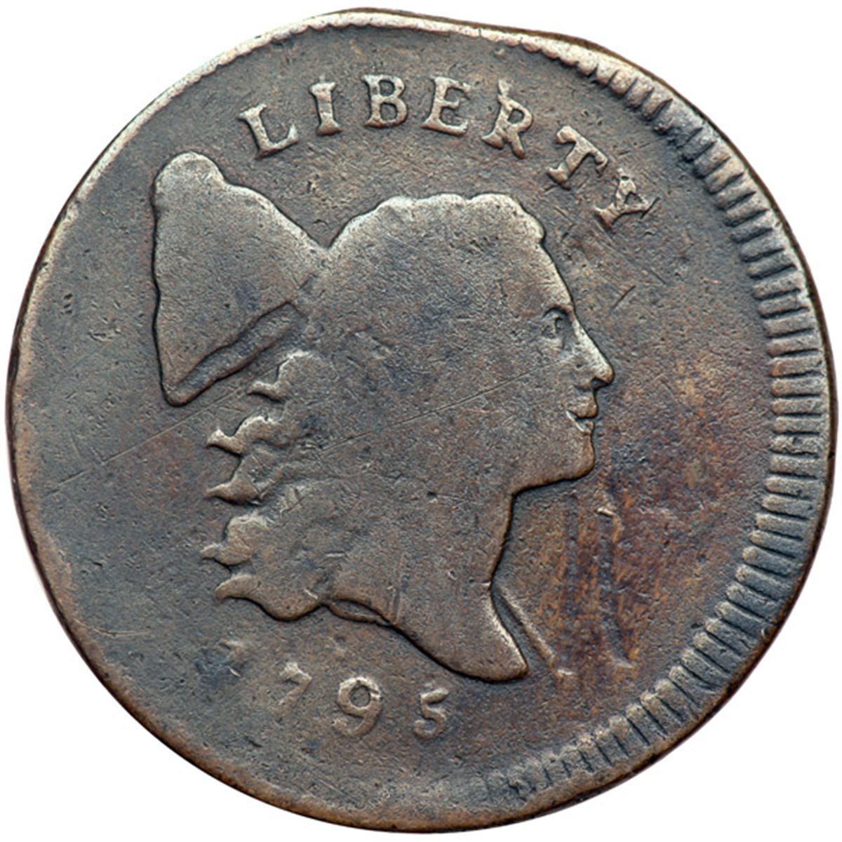 1795 C-4 R3 Punctuated Date, Plain Edge G6. Clipped Planchet. A couple points sharper but there are two very dull vertical scratches in the field before the neck. No additional defects of any significance. Lightly cleaned and retoned a slightly glossy chocolate and steel brown blending to darker olive brown. The date is clear although the punctuation (comma between the 1 & 7) is very faint, and the legends are clear except for the usual weakness in the center of the reverse. A straight-edge planchet clip (end of strip clip) affects the dentils at the top of the obverse and comes close to touching the base of the fraction on the reverse. Weight 73.8 grains.
