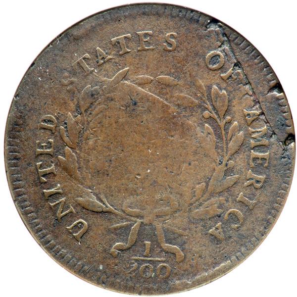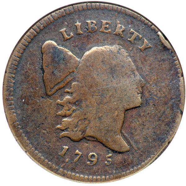 1795 C-4 R3 Punctuated Date with Plain Edge ANACS graded G6. ANACS graded Good-6. Glossy olive brown and chocolate with darker olive and steel toning in protected areas. The surfaces are nearly smooth but there are a few marks. These include a rim bruise at the Y in LIBERTY and a planchet fissure with three small voids above F-AM (as struck). The date is strong, including the comma between the 1 & 7, and the legends are complete except for the usual weakness inside the wreath. LDS. The die crack through the upper half of the wreath is strong. Our grade is net G5. The attribution is noted on the ANACS label.