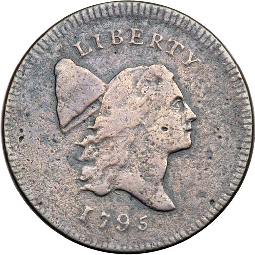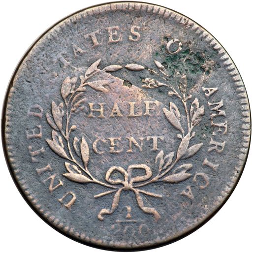 1795 C-5b R4 Thick Planchet VG8. Sharpness F15 but covered with microscopic roughness and there is a patch of pitting at OF that contains traces of greenish verdigris. No contact marks. Lightly cleaned with glossy dark olive and steel toning in protected areas blending to lighter steel brown toning on the highpoints. The date is clear and the legends are complete, including HALF CENT, which is unusual due to the heavy die failure across the reverse. Struck on a thick planchet intended for a large cent. Weight 110.2 grains.