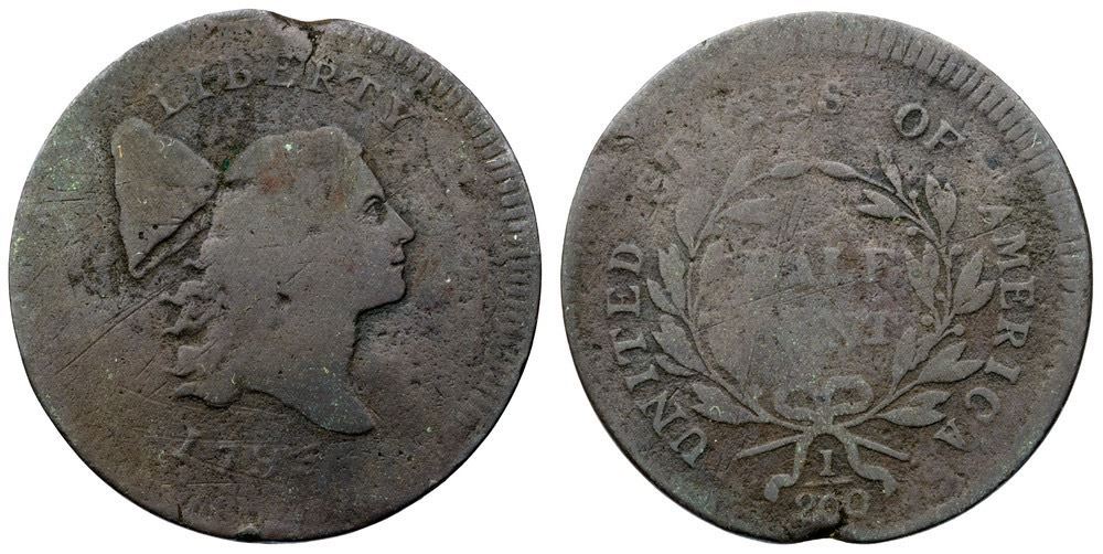 A couple points sharper with some shallow pitting and fine hairline scratches on both sides. No verdigris. The date is weak but complete and readable. The legends are clear except for CE in CENT. Partly glossy chocolate and steel. Struck on an incomplete planchet displaying an obvious void and thin planchet crack above ER in LIBERTY and under the fraction. Weight 79.5 grains. Davy #95.6a.26.