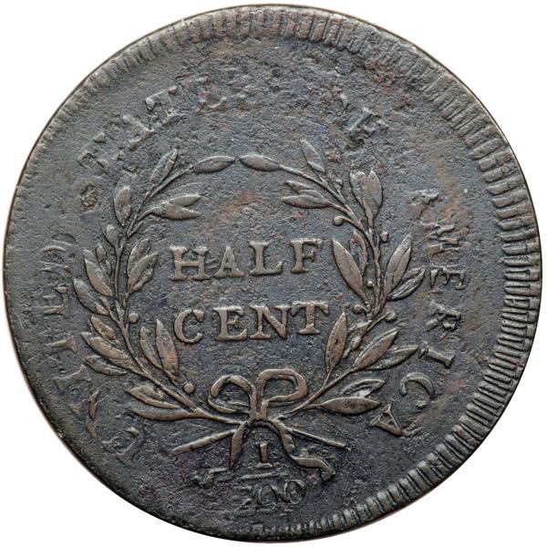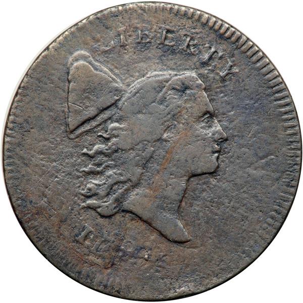 1795 C-6a R2 No Pole, Thin Planchet VG7. Double Struck with Small Offset. Sharpness VF20, perhaps slightly better on the reverse, but the planchet displays very fine corrosion and the obverse was lightly smoothed to minimize the roughness. No verdigris or notable contact marks. Rather glossy olive brown and dark steel with lighter chocolate toning on some of the highpoints. Double struck very slightly off center to K-9. The shift between impressions was very small, perhaps a millimeter at most, but the doubling is sharp and obvious, especially on the cap and at the fraction. The date now reads "117995" although it takes a glass to make out all the numerals. Weight 77.7 grains. Davy #95.6a.37.
