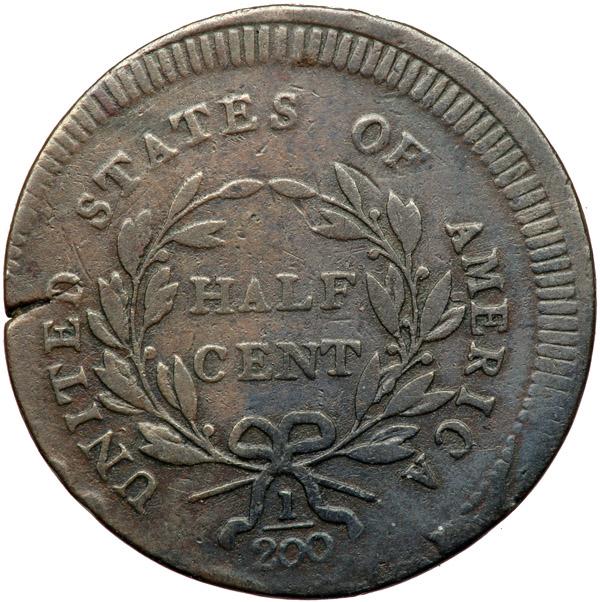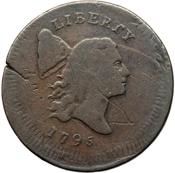 1795 C-6a R2 No Pole, Thin Planchet VG7. Flipover Double Strike. Several points sharper but the obverse is covered with hairline scratches and there is a stronger, dull scratch in the field before the neck. No corrosion or verdigris, and the only other defect is a planchet crack in the dentils left of the bottom of the cap passing through to the top of the D in UNITED. Otherwise the planchet is smooth and attractive, especially on the reverse where the mint-made planchet crack is the only significant flaw. This piece was double struck and both strikes were off center. The first strike was about 15% off center. Then the planchet was flipped over and struck a second time 5% off center to K-11. AME is clearly visible in the field at the bottom of the cap and the bottom of ED (from UNITED) plus parts of the wreath are obvious right of the Y in LIBERTY. The top of Ms Liberty's cap shows over ICA on the reverse. Additional undertype from the initial strike can be found on both sides. The date and legends from the second strike are complete and clear. (Note: The diameter of this piece is about a millimeter larger than normal for the variety, 24.5mm versus 23.5mm. We can attribute this to being struck a second time with the extra strike further squeezing the metal outward. Remember, at this time there was no tight collar to restrict the radial flow of the planchet metal. The planchet crack most likely resulted from the extra stress on the planchet metal which had already been hardened by the initial strike.) Weight 80.2 grains. Davy #95.6a.42.