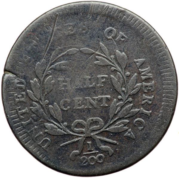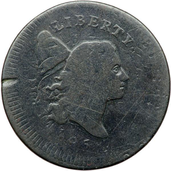 1795 C-6a R2 No Pole, Thin Planchet VG7. Flipover Double Strike over 1794 TAL Cent. Very slightly sharper but there are a few very faint hairlines across the bottom of the neck and a dull scratch at TAT in STATES. Otherwise the surfaces are smooth and attractive, void of any notable defects other than a mint-made planchet crack at the edge left of the portrait and at the D in UNITED. Glossy olive brown and chocolate. Double struck and flipped over between those strikes on a cut-down 1794 TAL cent. Both strikes were reasonably well centered on the planchet, the first off perhaps 10% to K-9. Evidence from the reverse of first strike is obvious on the obverse of the dominant second impression and includes AMERICA in the field under the cap down to the date, ED STA near the edge before the forehead, the fraction at LI, and parts of the wreath on the cap. Undertype from the obverse of the first strike is less obvious on the reverse, but the bust tip and neck show under OF, the top of the cap is located at the right end of the denominator, and LI from LIBERTY is visible under NIT in UNITED. In addition to the evidence of the double strike there is ample undertype from the TAL cent that was cut down to make the planchet. The RK from NEW YORK of the TAL, which identifies this as a 1794-dated example, is visible at the rim before the mouth. The diameter is a half millimeter larger than normal thanks to the extra strike, and the planchet crack on the edge of the planchet is most likely a result of the second impression (similar to the preceding lot). The date and legends are complete and easily readable although STATES is relatively weak. Weight 80.8 grains. Davy #95.6a.55.