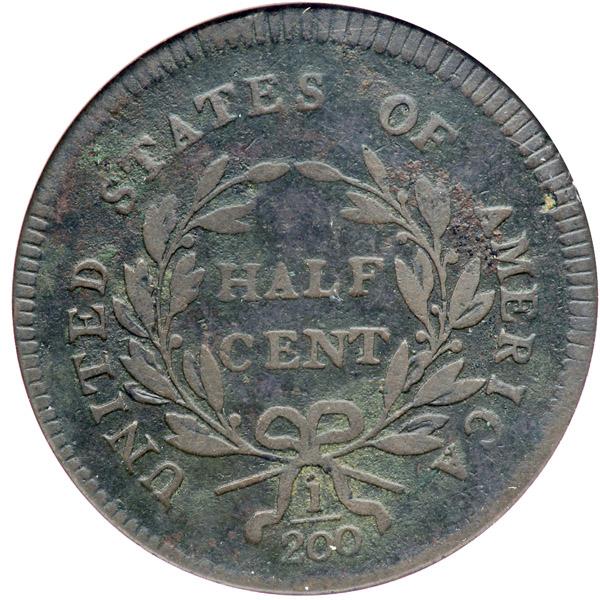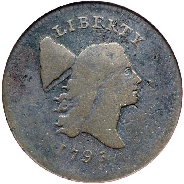 1795 C-6a R2 Without Pole. ANACS graded VG-8. Rather glossy dark olive and steel with lighter steel brown toning on the devices. The planchet is relatively smooth but a glass reveals microscopic roughness and traces of shallow verdigris in protected areas. The only marks of any significance are four small pinpricks before the face and a shallow pit at the dentils over the first A in AMERICA. The date and legends are complete and clear. Our grade is VG7+ sharpness net G6. The attribution is noted on the ANACS label.