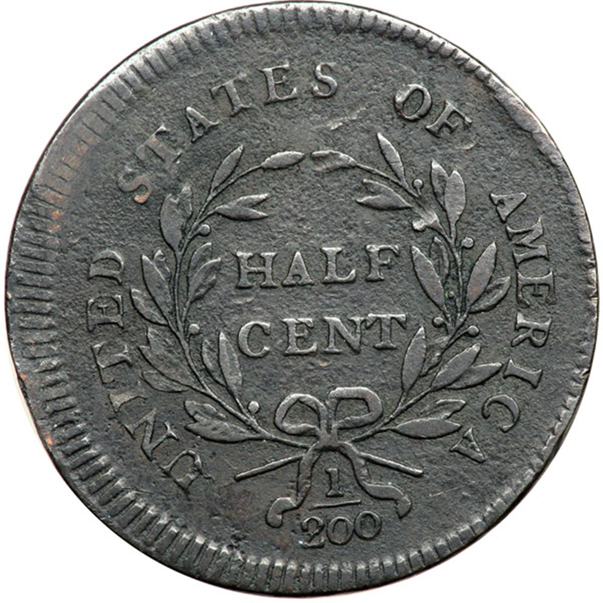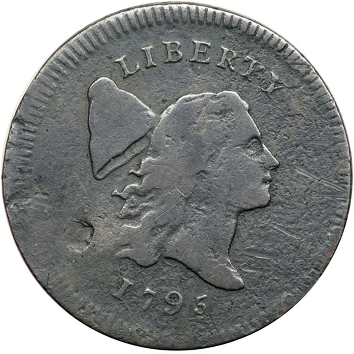 1795 C-6a R2 Without Pole, Thin Planchet VG7. Off Center. Sharpness F12 but there is a dull dent in the field left of the lower curls and the dentils to the left of the dent have been flattened. The fields and protected areas are covered with minor roughness while the devices are smooth. No verdigris, but there are a few light marks in the field before the portrait. Rather glossy dark chocolate and steel. The date is clear and the legends are strong. Struck slightly off center to K-4 but not enough to affect the legends. Weight 81.7 grains.