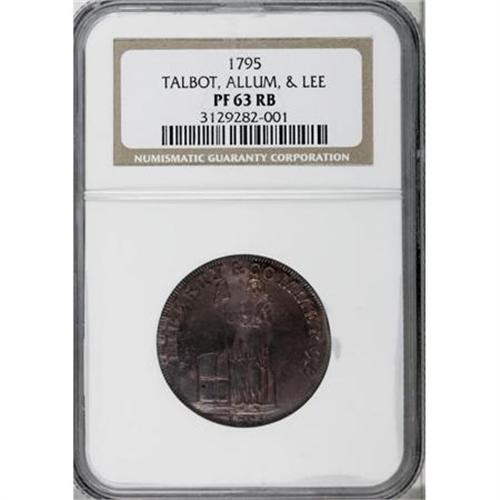 <B>1795 Cent Talbot, Allum & Lee Cent PR63 Red and Brown NGC.</B></I> Breen-1035, Fuld-1. Mellowed mint red and powder-blue grace the obverse. The reverse is ocean-blue and olive with peripheral rose tints. Well struck and flashy with a few hairlines on the lower right obverse. Listed on page 72 of the 2008 <I>Guide Book.</B></I><BR><BR><b>Shipping:</b> Coins & Currency (<a target="_blank" href="http://www.heritageauctions.com/common/shipping.php">view shipping information</a>)