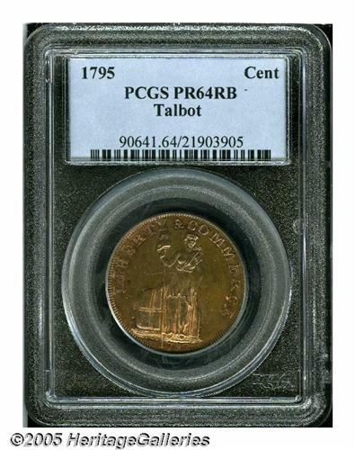 <B>1795<Cent> Talbot, Allum & Lee Cent PR64 Red and Brown PCGS.</B></I> Breen-1035. An intricately struck specimen with blazing orange color throughout the legends and outlining the devices. The fields and highpoints have gently toned in lilac hues. A few small areas of dark mahogany color are also present. The obverse field exhibits tiny mint-made strike-throughs. Rare in proof format, although circulated commercial strikes are available. Listed on page 62 of the 2005 <I>Guide Book.</B></I> Population: 5 in 64, 2 finer (6/05).