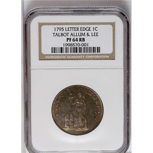 <B>1795<Cent> Talbot, Allum & Lee Cent PR64 Red and Brown NGC.</B></I> Breen-1035. A rare proof of this popular early American token. The strike is penetrating throughout, and the light lime, gold, plum, and powder-blue toning is attractive. No obvious spots or hairlines are detected. Listed on page 72 of the 2007 <I>Guide Book.</B></I>