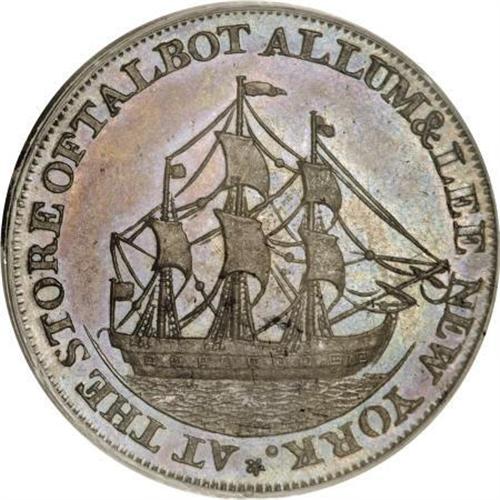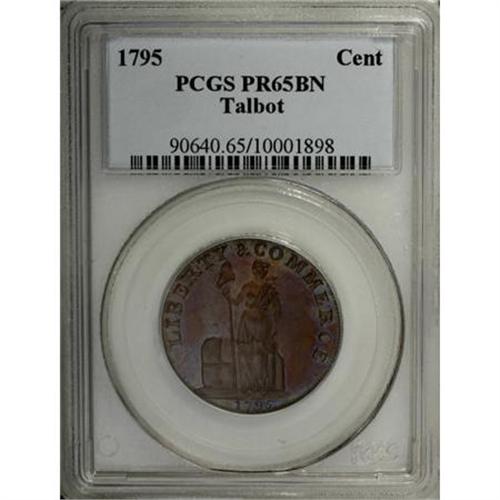 <B>1795 Cent Talbot, Allum & Lee Cent PR65 Brown PCGS.</B></I> Fuld-1, Breen 1035. When this chocolate-brown piece is rotated beneath a light, gorgeous powder-blue, plum-red, and chestnut shades emerge. Intricately struck and nicely mirrored. A solitary obverse lintmark is noted near 8 o'clock. The very scarce proofs for this date were presumably struck by Kempson's Birmingham mint for sale to Condor token collectors. Population: 6 in 65 Brown, 0 finer (1/08).<BR><BR><b>Shipping:</b> Coins & Currency (<a target="_blank" href="http://www.heritageauctions.com/common/shipping.php">view shipping information</a>)