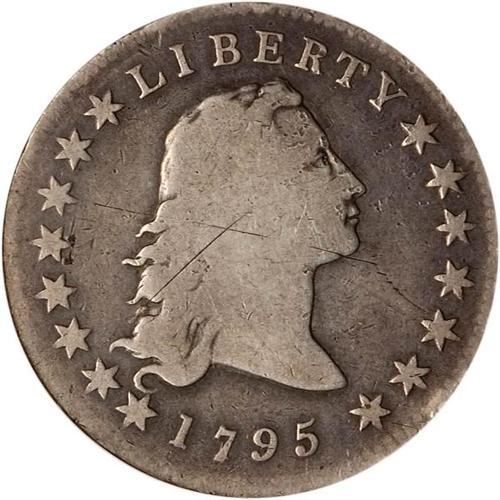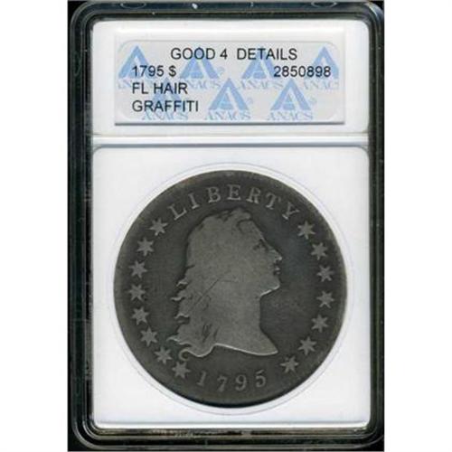 <b>1795 Flowing Hair Dollar. 3 leaves beneath each wing. ANACS graded Details of G4 Graffiti.</b> Some scratches. The desirable flowing hair design with smooth medium gray fields offset by lighter gray or "two-tone" devices. Barring the graffiti, a choice looking coin <b>(PCGS # 6852)</b> <i>