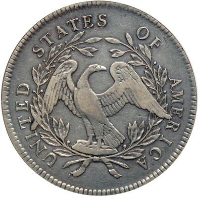 The pupil of Liberty's eye is visible, even on this lightly worn specimen. The lowest hair curl consists of multiple individual hair strands on the Flowing Hair dollars of 1795, at least six in this case. BB-18 is slightly unusual: Counting upwards, the fourth curl ends in five tiny strands of hair. The reverse has similar well-defined devices, with exceptional detail in the eagle's wings and the individual leaves.