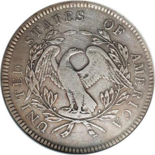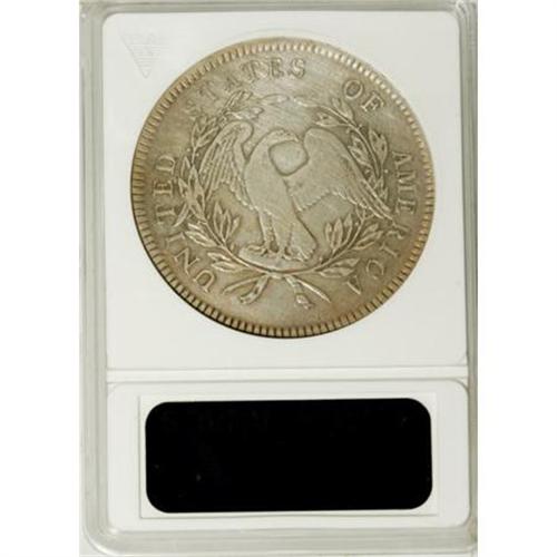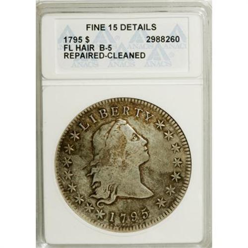 <B>1795 $1 Flowing Hair, Three Leaves--Repaired, Cleaned--ANACS. Fine 15 Details.</B></I> B-5, BB-27, R.1. Bowers-Borckardt Die State II. Orange-gold and sea-green dominate the borders of this thickly hairlined Flowing Hair type coin. The right obverse field likely conceals a well-done repair. Collector demand for early silver type coins has risen substantially over the past ten years.<BR><BR><b>Shipping:</b> Coins & Currency (<a target="_blank" href="http://www.heritageauctions.com/common/shipping.php">view shipping information</a>)