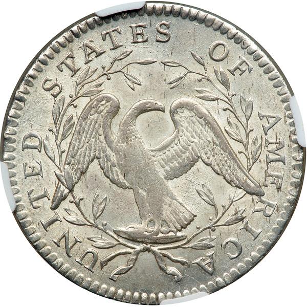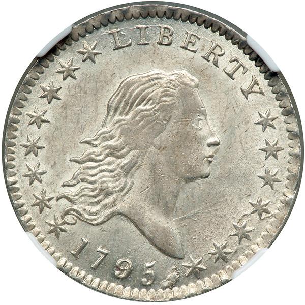 1795. O-113a. NGC graded MS-64. Struck on a problem-free planchet with nice broad denticles. A frosty white coin. Overton-113 is an interesting variety where the A is over an earlier E in STATES. The obverse die is identified by a die chip between the 5 and final star. The engraver may have been inattentive when he produced this die, or, having selected his letter punches and laid them out on his workbench, accidentally picked up the E first when he meant to use an A-punch. In most areas in life, a mistake of this kind is easily rectified. However, in the 1790s post-colonial America, die steel was costly and its supply limited. It had to be used sparingly. Many other such preparation "errors" occur on dies in the 1790s to 1830s, so this one fits the precedent. All die engravers in those days used hand tools and special punches rather than the various hubs that are used today. They employed them to insert the stars, letters, date digits, and the like, even to the individual berries on the branches. Hence, the tendency to make mistakes.