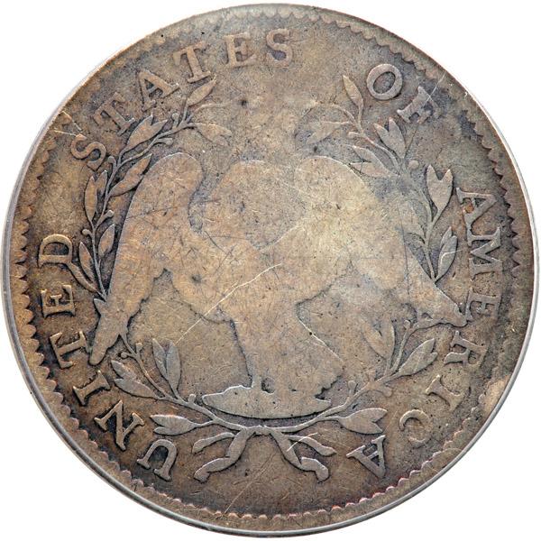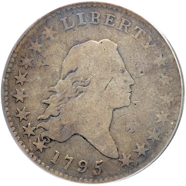 1795 Flowing Hair Half Dollar. . Overton-115, Rarity-5. PCGS graded Good-6. Nice old time toning. Nice clear date. In this variety the first star pierces the first curl while star 2 touches the second curl above the end. On the reverse, berries are 8-8, with a leaf attached to the left base of D in UNITED (PCGS # 6052) .
