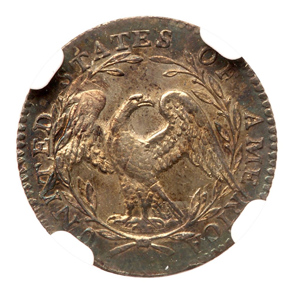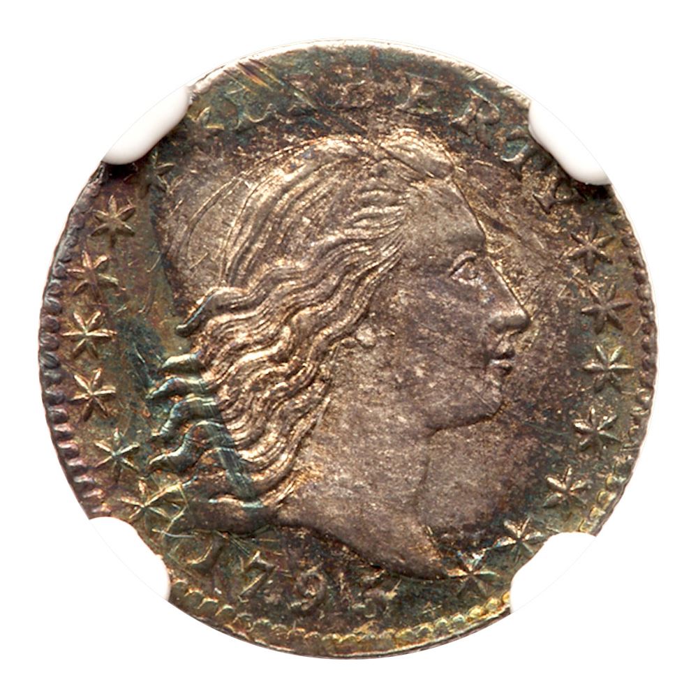 1795. NGC graded MS-64. Nicely toned with deeper blue and gold on both sides, handsomely arranged by time and nature. The strike is exceptionally bold, with each hair strand on Liberty bold, as well as the eagles feathers. Quite extraordinary for a half dime of the first large group coined by the Mint in Philadelphia. The surfaces are super clean and show only a few microscopic signs of handling. Lustrous and flashy withint the protected areas where the toning allows the light to bounce back. This type coin was issued only for about a year, dated both 1794 and 1795, the Flowing Hair half dimes are a true rarity for collectors to find in grades even approaching this amazing MS-64 coin. The A popular type coin. Only 86,416 struck. Pop 32; 21 finer at NGC. Estimated Value 15,000 - UP