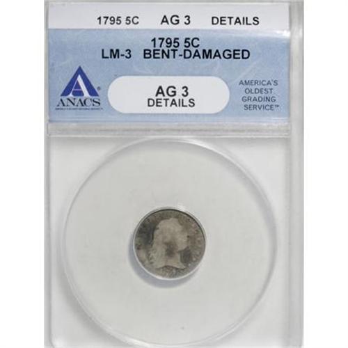 <B>1795 H10C --Bent, Damaged--ANACS. AG3 Details.</B></I> V-2, LM-3, R.5. A dig near 9 o'clock on the obverse bends the coin, causing uneven wear along each lower left border. Nonetheless, sharper than the usual AG3 example, with most stars, letters, and berries clear.<BR><I>From The John Stimson, Sr. Collection, Part Two.</B></I><BR><BR><B>Coin Engraver:</B> Robert Scot<BR><BR><b>Shipping:</b> Coins & Currency (<a target="_blank" href="http://www.heritageauctions.com/common/shipping.php">view shipping information</a>)