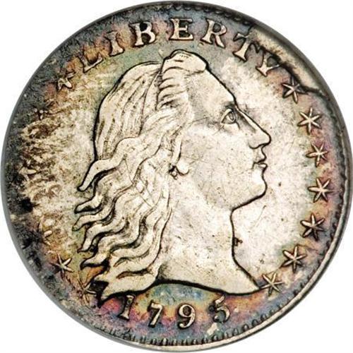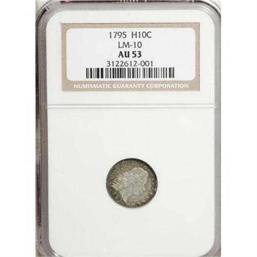 <B>1795 H10C AU53 NGC.</B></I> V-4, LM-10, R.3. The 1 in the date touches the lowest hair curl, and the 5 touches the bust. This is one of the more available die pairings for the year. The present example offers silver, lustrous surfaces with a ring of gold around each side. The peripheral details from 6 to 10 o'clock on each side are weak because of die misalignment (on this example, as well as die lapping on all examples), with the opposing details correspondingly bolder. A rim cud appears above TY and star 9 to the rim, as often seen, with a light die crack also from that star to the rim. Another die crack shows from the T in LIBERTY down to the eye. A few thin pinscrapes are seen over Liberty's profile. Otherwise, the coin shows few mentionable distractions and offers good eye appeal.<BR><I>From The John Stimson, Sr. Collection, Part One.</B></I><BR><BR><B>Coin Engraver:</B> Robert Scot<BR><BR><b>Shipping:</b> Coins & Currency (<a target="_blank" href="http://www.heritageauctions.com/common/shipping.php">view shipping information</a>)