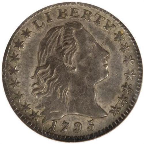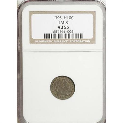 <B>1795 H10C AU55 NGC.</B></I> V-5, LM-8, R.3. The second and final year of the Flowing Hair type. This piece, a Choice AU survivor, has deep steel and grayish-gold toning on both sides. The strike is somewhat indistinct on portions of the devices, but the right-side borders are sharp. A small planchet lamination is hidden in the hair. The obverse die is extensively cracked as usual.<BR><BR><B>Coin Engraver:</B> Robert Scot<BR><BR><b>Shipping:</b> Coins & Currency (<a target="_blank" href="http://www.heritageauctions.com/common/shipping.php">view shipping information</a>)