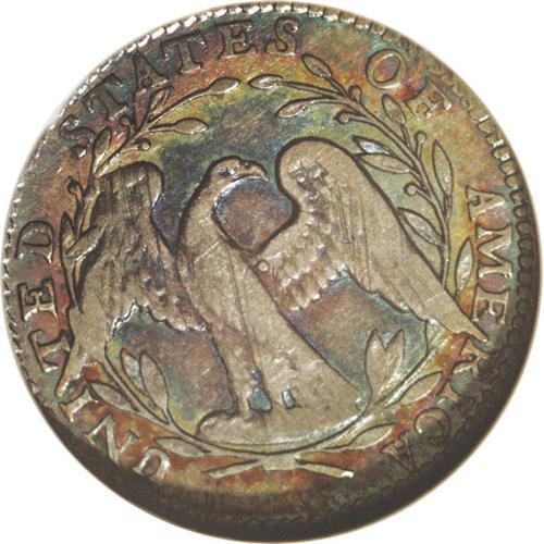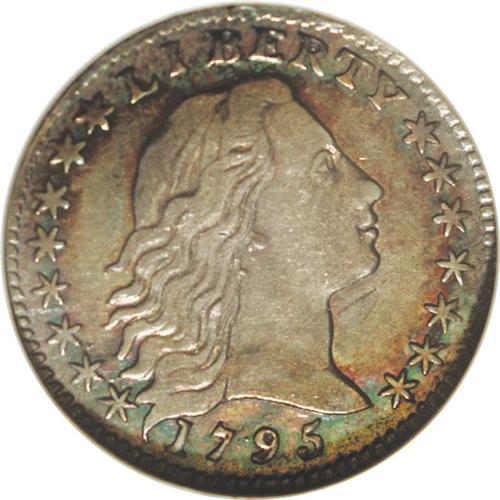 <B>1795<H10C> AU58 NGC.</B></I> V-5, LM-8, R.3. Beautifully toned in powder-blue, salmon-pink, rose-gold, lemon, and lime hues. A charming example of this popular early type. The strike shows slight bluntness on the extremities of the devices, but little actual wear is apparent. This is confirmed by the extensive flashy luster throughout the borders, wreath, and hair. Moderate parallel adjustment marks are noted on the eagle, but these were present on the planchet prior to the strike, and do not affect the technical grade. The Flowing Hair design was struck in small format only on half dimes, since dimes and quarters were not produced until 1796, after the Draped Bust design became uniform on silver coinage.